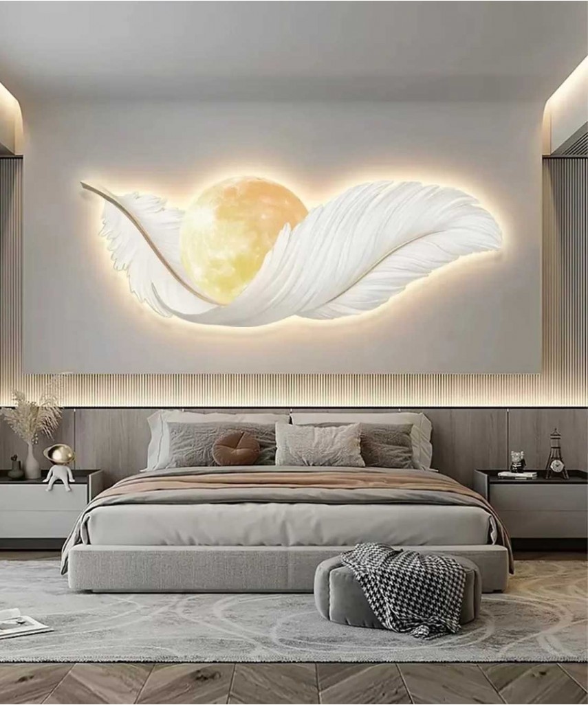 Crystal Feather Yellow Moon Wall Painting With Led Light 50*150 Cm