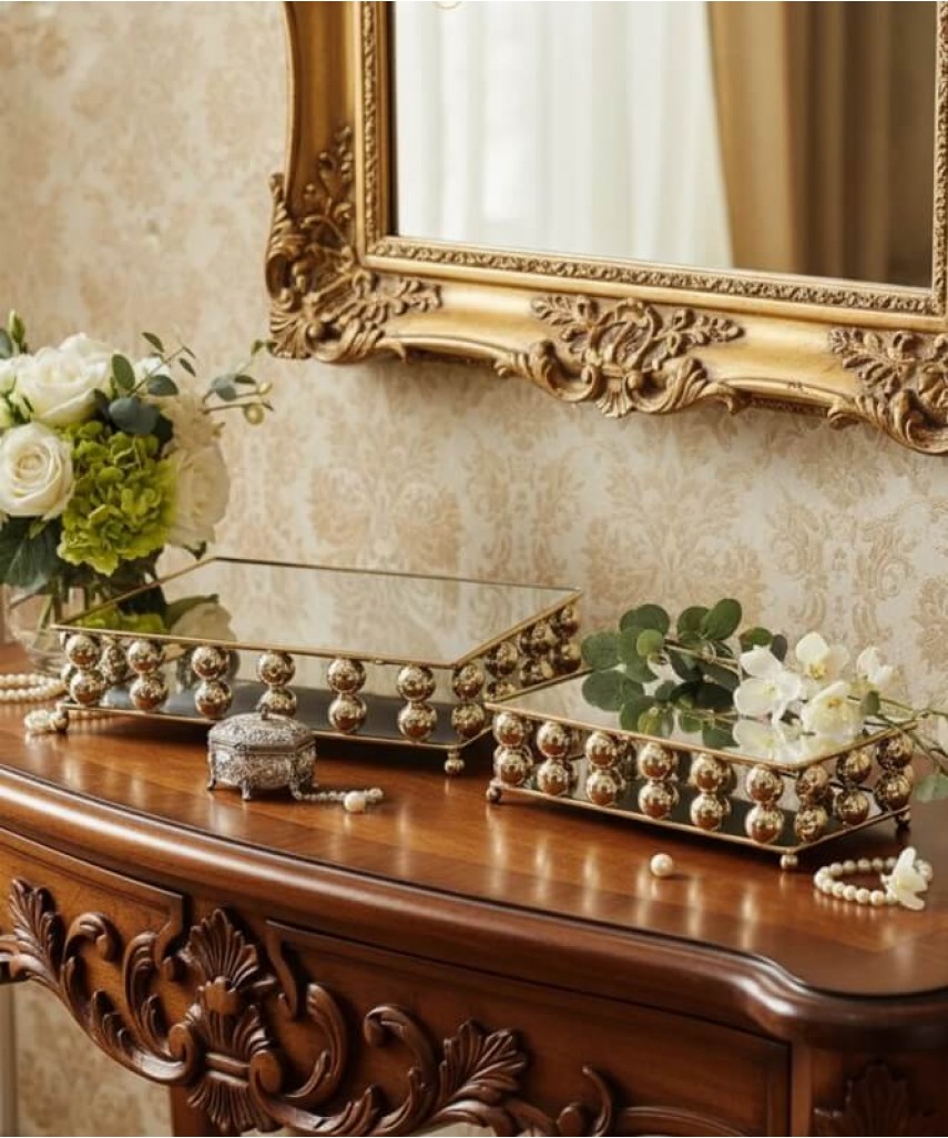 Add a refined touch of elegance to your home décor with these luxurious mirrored decorative trays. Designed with a sleek rectangular shape and finished with a reflective mirrored surface, each tray rests on a beautifully crafted gold-tone base adorned with decorative spherical beads that create a rich and sophisticated look.