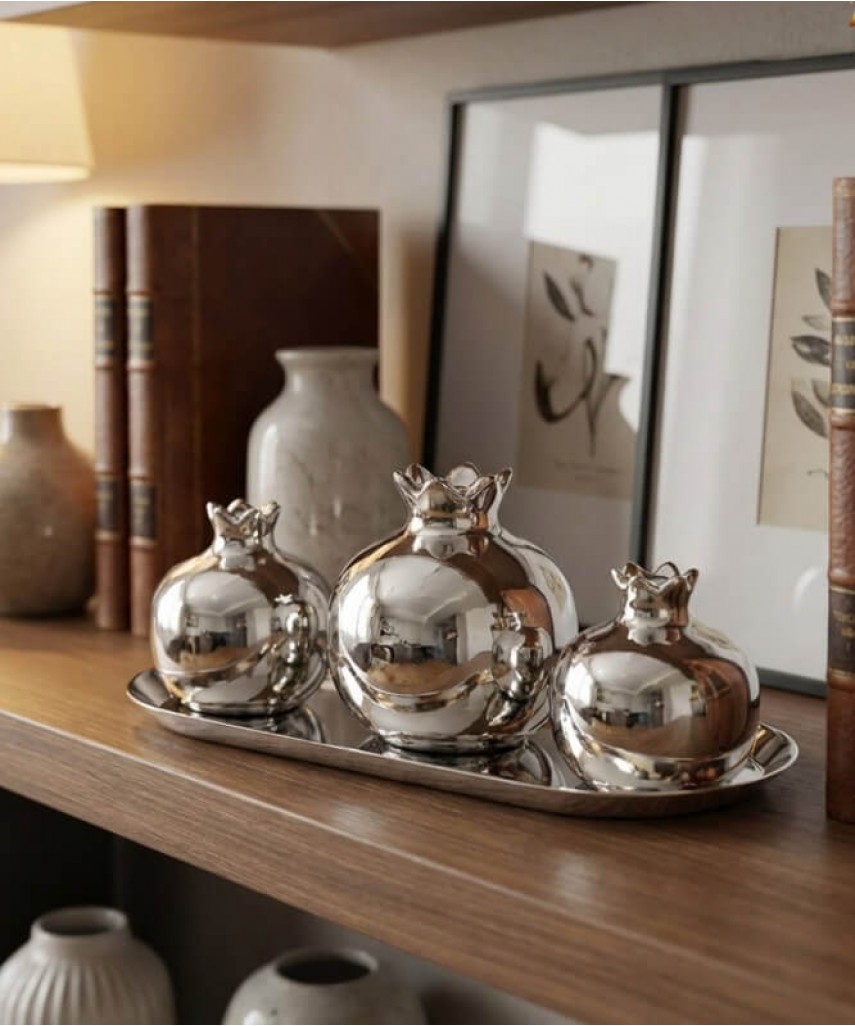 ZEYVE SILVER CERAMIC 3-PIECE POMEGRANATE SET TRAY 23x10x9cm